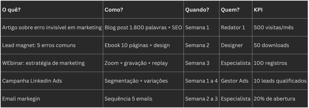 Cada item tem: O quê, Como, Quando, Responsável, Métrica esperada.
