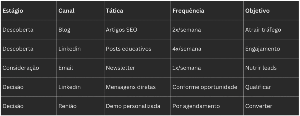 Objetivo: escolher quais canais e táticas usar para atingir sua persona, em cada estágio.