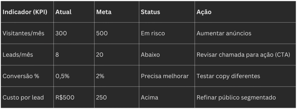 - “Aumentar tráfego orgânico de 100 para 500 visitas/mês em 90 dias”